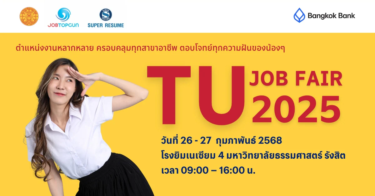 สำหรับข้อมูลเพิ่มเติมเกี่ยวกับงาน TU JOB FAIR 2025 สามารถติดตามได้ที่หน้า Facebook ของมหาวิทยาลัยธรรมศาสตร์